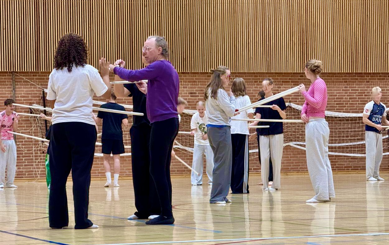 Working with some 70 students over three days at Ringkøbing Gymnasium. The students were encouraged to work with their body as a tool to practice physical control and flow of movement. Then bringing their experience of the physical exercises into play with the addition of an object – the stick. Moving amongst eachother in pairs with the stick between them, their spacial awareness was challenged along with their ability to stay focused and communicate - not just verbally, but also physically.